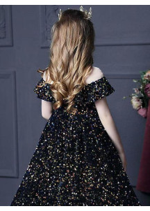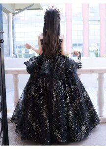 The deep black, combined with the sparkling stars and golden embroidery, gives this dress a festive and refined elegance. An ideal creation for a little girl who wants to shine brightly at a wedding or special occasion.