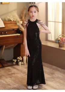 The choice of black, a timeless color of elegance, paired with sparkling sequins, gives this dress a chic and festive appearance. The minimalist design highlights the quality of the fabric and the beauty of the lines. An ideal creation to make a little girl a standout appearance at a wedding or prestigious evening event.