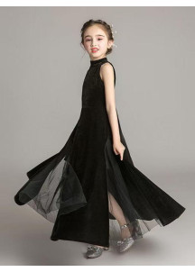 Fashion perspective: The simplicity of this dress is its greatest asset. The choice of black satin gives it a chic and timeless look, perfectly suited for formal occasions. The absence of unnecessary details highlights the fluid drape of the fabric and the child's natural grace.