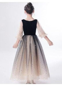 €32.39This flower girl dress is an exquisite combination of sophistication and childlike charm. The black velvet bodice, with its elegant V-neckline, contrasts beautifully with the sparkling tulle skirt. The mid-length transparent tulle sleeves, adorned with delicate sequins, add a touch of whimsy and romance. The full and flowing skirt allows for great freedom of movement, essential for little flower girls.