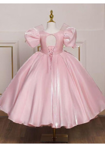 The choice of organza for the skirt adds fluidity and lightness to the overall design, while the embroidery and sequins on the bodice create a refined play of textures. The soft, delicate rose color perfectly complements the fairy-tale style of the dress. This creation is perfect for a grand occasion such as a wedding, baptism, or elegant reception.