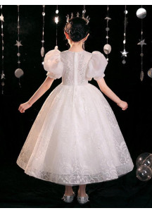 €39.59This flower girl dress is the epitome of elegance and sophistication. Made from immaculate white tulle, it is adorned with discreet floral embroidery that gives it a refined look. The fitted bodice, enhanced with pearls and sparkling sequins, is elevated by delicate puffed sleeves in transparent tulle. The full and flowing skirt, reaching mid-calf length, adds a touch of lightness and grace to the overall design.