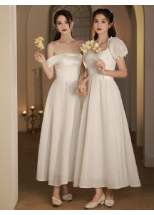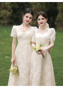 €47.99Behold this exquisite bridesmaid dress, perfect for an outdoor summer ceremony. The dress is crafted from elegant and lightweight lace that beautifully drapes the body. The delicate straps tie at the shoulders, adding a romantic and trendy touch, while the empire waistline delicately flatters the figure. The length of the dress is ideal for a rustic or bohemian wedding, and the soft cream color perfectly complements a natural setting.