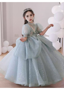 €64.79This ceremony dress for kids is simply enchanting. The sky blue color evokes sweetness and innocence, while the sparkling sequins add a touch of magic and glamour. The fitted bodice, adorned with transparent lace and pearls, highlights the child's delicate silhouette. The long, transparent tulle sleeves with sparkling details add a romantic and sophisticated touch.