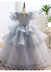 €55.19This child's ceremonial dress is a true masterpiece of romance and elegance. Made from sky blue tulle adorned with fine sparkling sequins, it evokes a frozen fairy tale. The fitted bodice, magnificently embroidered with lace and silver pearls, is elevated by a touch of transparency at the neckline and short sleeves. The voluminous skirt, composed of multiple layered ruffles, creates a fairy-tale cascade effect and gives the silhouette a majestic appearance.