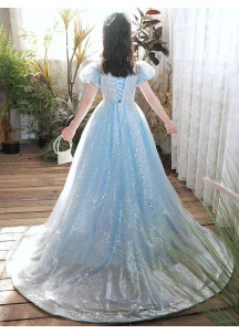 The choice of sky blue, a soft and dreamy color, combined with the sparkling details and silver embroidery, reinforces the fairy-tale aspect of the dress.