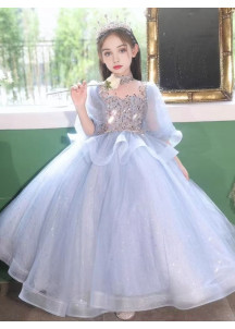 €64.79This ceremony dress for kids is simply enchanting. The sky blue color evokes sweetness and innocence, while the sparkling sequins add a touch of magic and glamour. The fitted bodice, adorned with transparent lace and pearls, highlights the child's delicate silhouette. The long, transparent tulle sleeves with sparkling details add a romantic and sophisticated touch.