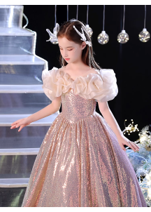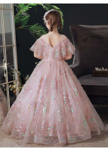 The combination of rose-powder color and iridescent sequins creates a fairy-like and dreamy effect. The classic cut of the dress is updated with trendy details like puffed sleeves and a plunging neckline, where the little girl will feel like a real princess.