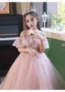 €49.19This charming wedding dress for a young girl perfectly marries romance and modernity. Made from rose-colored tulle sprinkled with sparkling sequins, it evokes a modern fairy tale. The flowing, full skirt creates a fairy-like silhouette, while the top of the dress, with its bare shoulders and short, ruffled sleeves, adds a touch of sophistication. Floral embroidery and fine pearls adorn the bodice, adding a touch of delicacy and refinement.