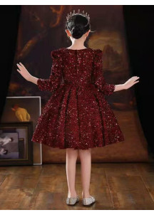 €37.19This party dress for little girls radiates intense glamour and sophistication. Entirely embroidered with sparkling red Bordeaux sequins, it captures the light and animates the silhouette with a festive sparkle. The short and slightly flared skirt is both elegant and comfortable, allowing the child to move freely. The fitted bodice, with long sleeves and slightly puffed shoulders, adds a touch of romance and femininity.