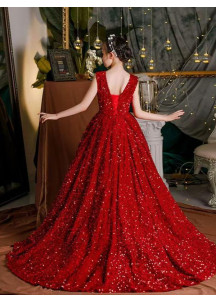 The generous use of red sequins creates a strong and festive visual impact. The classic cut of the dress, with its full skirt and fitted bodice, is timeless and flatters all body types. The train adds a touch of sophistication and grandeur, making it ideal for a special occasion.