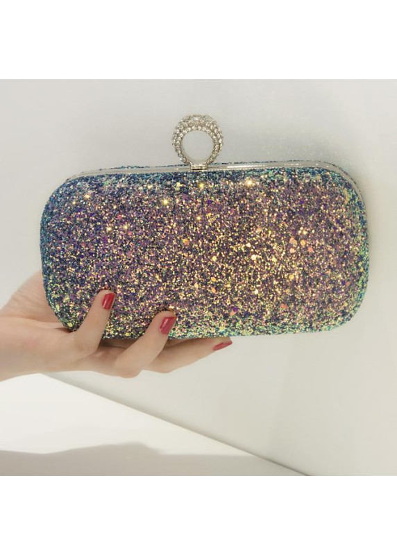 This stunning evening clutch, entirely covered with multicolored sequins, exudes a captivating charm and fantasy. Its bold design, enhanced by a ring set with sparkling crystals, lends this model a resolutely festive and joyful air. The accumulation of these small shimmering sequins creates a hypnotic kaleidoscope effect, perfect for captivating all eyes. This creation embodies the spirit of celebration and festivity. An iconic accessory of the season, this clutch will undoubtedly bring a touch of magic and brilliance to any outfit. A must-have fashion piece to illuminate the most beautiful evenings.