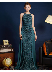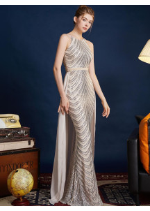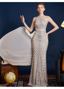 This silver evening gown is a spectacular and sophisticated creation. Its mermaid silhouette, fitted and flared, subtly accentuates the figure. The chevron pattern, created by the sequins, adds a touch of geometric elegance. The halter-neck top is both elegant and modern. The long, detachable train in flowing fabric adds a dramatic and regal dimension to the outfit. The sequined fabric is luxurious and sparkling. The silver color is luminous and flattering. Perfect for a grand occasion, this gown is ideal for those who want to make a striking entrance and shine with a thousand lights.