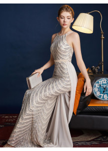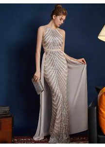 Silver Evening Gown with Chevron Pattern Halter Neck and Detachable Train