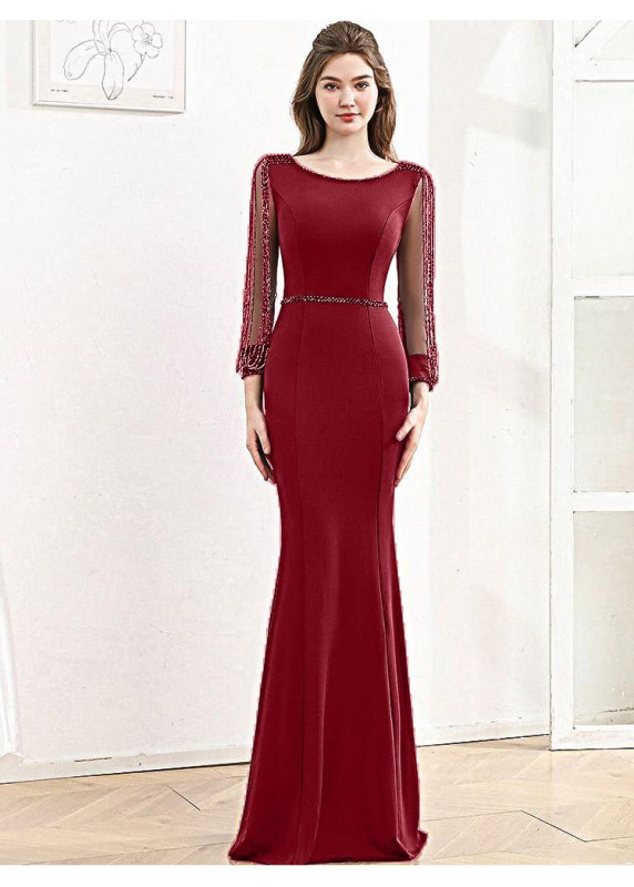 This navy blue evening gown is an elegant and refined creation. Its mermaid silhouette, fitted and flared, subtly accentuates the figure. The top, with its round neckline, is simple and elegant. The long sleeves, made of transparent tulle and adorned with beaded fringe details, add a touch of originality and sophistication. The waistline is emphasized by a delicate belt. The fabric appears fluid and silky. Ideal for a special evening, this gown is perfect for those seeking an elegant and feminine outfit, without being too ostentatious. The balance between the simplicity of the gown's body and the originality of the sleeves is a major asset of the design. The navy blue color is timeless and flattering.
