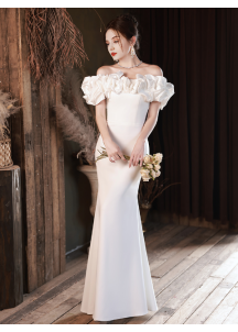 This is a stunning white evening gown with elegant and refined lines. The fitted silhouette accentuates the body's harmonious curves, while the ruffles on the shoulders add a touch of delicacy and femininity. The embroidered details on the bodice lend a refined elegance to this creation. The overall look exudes a glamorous and sophisticated air, perfectly suited for a gala evening or formal event. The design highlights the wearer's silhouette, giving them a natural poise and confidence. This gown masterfully combines modernity and tradition, offering a contemporary interpretation of a classic style. The result is a timeless piece that will seduce even the most discerning fashion enthusiasts.