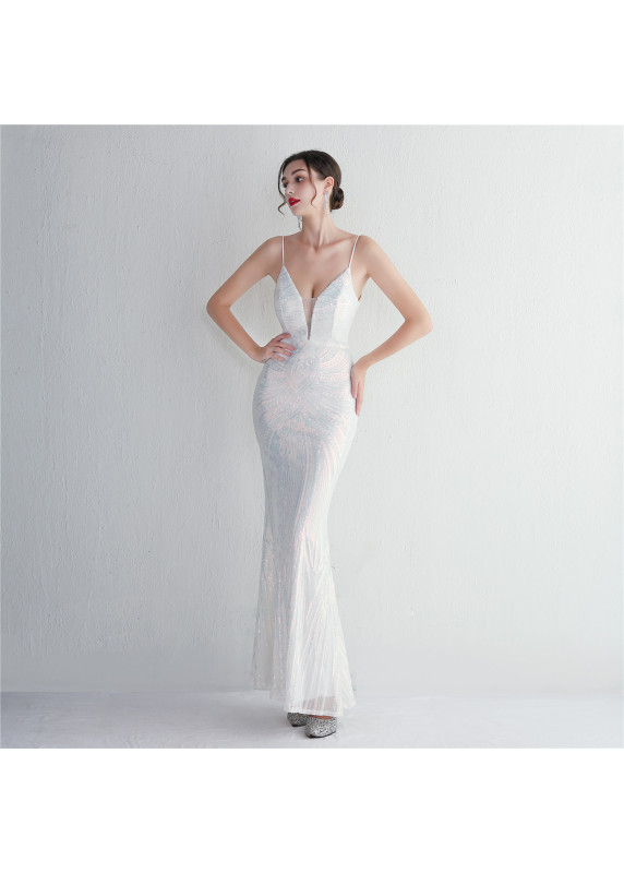 This glamorous, fitted evening gown in mauve sequins exudes sophisticated elegance. The plunging bodice and delicate straps beautifully accentuate the wearer's silhouette. Geometric patterns and shimmering reflections add a touch of modernity to this special occasion dress. This bold yet refined design will showcase the beauty and confidence of the woman who wears it, making her the center of attention at any special event.
