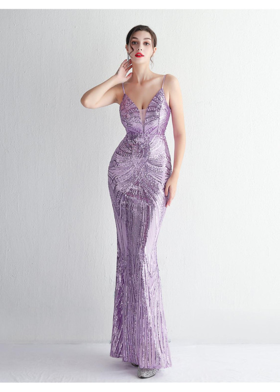 This glamorous, fitted evening gown in mauve sequins exudes sophisticated elegance. The plunging bodice and delicate straps beautifully accentuate the wearer's silhouette. Geometric patterns and shimmering reflections add a touch of modernity to this special occasion dress. This bold yet refined design will showcase the beauty and confidence of the woman who wears it, making her the center of attention at any special event.