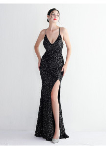 Sky Blue Sparkling Evening Gown with Plunging Neckline and Side Slit