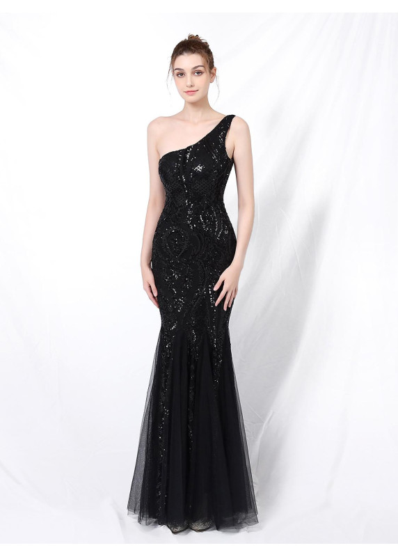 A grandiose evening gown with feminine and captivating allures. The asymmetric single-shoulder design creates an elegant line, enhanced by the shimmering sequins that adorn the dress. The fitted cut accentuates the curves of the silhouette while offering fluidity of movement thanks to the flared skirt. This model exudes an aura of refinement and sophistication, perfect for shining on an exceptional occasion.