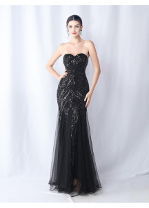 This fitted evening gown features an elegant and graceful silhouette. The structured bodice reveals a delicate play of lines, enhanced by the lace details and the flowing ruffles of the skirt. The ensemble offers a sophisticated and refined look, accentuated by the finesse of the materials used. This model will captivate attention with its harmonious blend of sensuality and elegance.