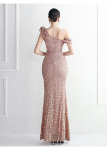 Refined Golden Rose Sequined Evening Gown with Asymmetric Neckline