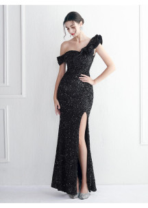 This evening gown captivates with its fabric entirely covered in shimmering golden rose sequins. The elegant asymmetric neckline enhances the bust line, creating a sensual and sophisticated look. The side slit subtly reveals the legs, adding a touch of sensuality. An exceptional model, combining dazzling radiance and refined details for an irresistibly glamorous silhouette.