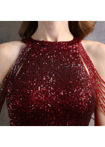 Fitted Burgundy Sequin Mermaid Evening Gown with Refined Details