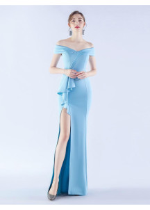 This evening gown captivates with its elegant and sensual allure. The bardot neckline delicately highlights the décolletage and shoulders. The fitted bodice and thigh-high slit skirt harmoniously embrace the curves of the silhouette. The asymmetric draping adds a touch of refined originality. The flowing satin creates a sophisticated effect. The ensemble offers a desirable silhouette and an impression of dazzling grace, making this dress the ideal choice to shine with brilliance at an exceptional occasion.