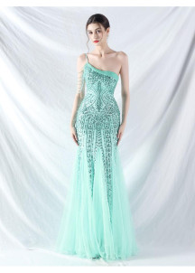 This evening gown captivates with its unique elegance and sophisticated charm. The asymmetric top with geometric sequin patterns creates a remarkable sculptural effect. The asymmetric cutouts on the shoulders and sleeves gracefully reveal the silhouette. The flared skirt, adorned with a fine layer of tulle, lends an airy movement to the silhouette. The ensemble masterfully combines purity of lines and luxurious finishes, making this dress the ideal choice to shine with a glamorous and refined allure.