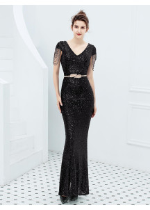 Black Sequined Mermaid Evening Gown with Short Sleeves and Chain Details