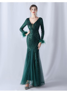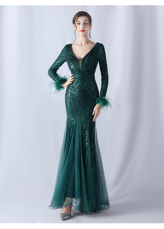 Sparkling Burgundy Red Evening Dress with Feather Accents