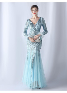 This sumptuous burgundy red evening dress captivates with its glamorous and elegant allure. The plunging neckline accentuated with shimmering sequins adds a touch of refined sophistication. The feathered sleeves lend a sense of lightness and femininity to the form-fitting silhouette. The flared tulle skirt creates a dramatic effect, perfect for the most prestigious occasions. This impressive gown will sublimate the beauty of the wearer with grace and elegance.