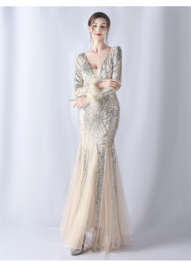 This evening gown captivates the attention with its magnificent sequin-embellished fabric. The halter neckline creates an elegant and graphic line, enhanced by the shimmering reflections of the structure. The figure-hugging cut harmoniously embraces the curves, while sensually revealing the slit leg. An exceptional model, combining sophistication and luminous brilliance for an irresistibly glamorous silhouette.
