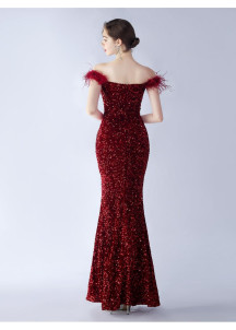 Sparkling Burgundy Red Evening Dress with Feathered Shoulders