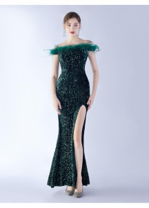This burgundy red evening dress captivates with its sophisticated look and daring style. The shimmering sequins covering the fabric create a striking effect, enhanced by the delicate feathered trim. The plunging neckline and dramatic slit add a touch of refined sensuality. This glamorous creation will sublimate the wearer's silhouette with a confident elegance.