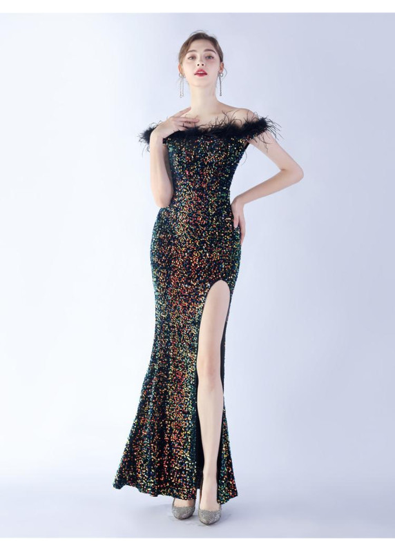 This burgundy red evening dress captivates with its sophisticated look and daring style. The shimmering sequins covering the fabric create a striking effect, enhanced by the delicate feathered trim. The plunging neckline and dramatic slit add a touch of refined sensuality. This glamorous creation will sublimate the wearer's silhouette with a confident elegance.