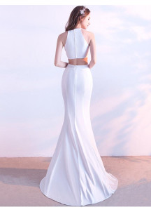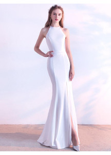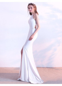 Este vestido de noche blanco es de una elegancia atemporal y refinada. Su silueta de sirena, ajustada a la cintura y luego acampanada, realza sutilmente la figura. El corpiño, con su escote redondo y espalda descubierta, es a la vez chic y moderno. La falda larga, con una ligera abertura lateral, aporta un toque de sensualidad sin ser vulgar. La tela, de aspecto sedoso y fluido, contribuye a la fluidez del vestido. El diseño es simple pero efectivo: la pureza de las líneas y el corte impecable crean un look sofisticado y elegante. El color blanco, símbolo de pureza y elegancia, es una elección perfecta para una ocasión especial. La ausencia de adornos permite que la belleza de la tela y el corte se expresen plenamente.