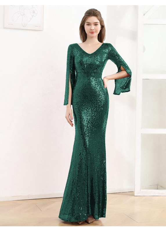 Vestido de Noche Burdeos con Escote en V y Mangas Largas con Aberturas