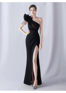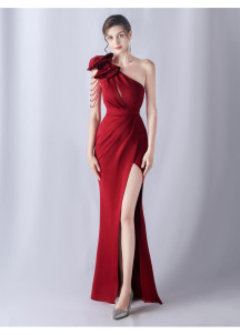 Este intenso vestido de noche luce un aspecto cautivador y audaz. El drapeado asimétrico en un solo hombro crea una línea escultural realzada por los sofisticados pliegues. La vertiginosa abertura revela una pierna estilizada, aportando un toque de sensualidad contrastado por la elegancia refinada del conjunto. Este modelo icónico seduce por su mezcla armoniosa de elementos dramáticos y glamorosos, perfecto para destacar en una ocasión excepcional.