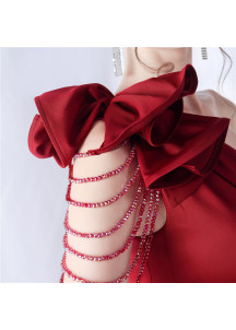 Vestido de noche rojo burdeos brillante con hombros de plumas