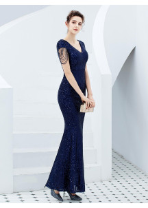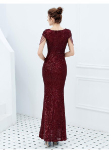 Este deslumbrante vestido de noche de color burdeos es una creación impresionante. El elegante escote en V y las mangas colgantes añaden un toque de refinamiento. El corte ceñido realza la silueta de manera sofisticada. Los brillantes lentejuelas confieren a la prenda un aspecto glamuroso y festivo, perfecto para ocasiones especiales. Esta vestimenta sublima la belleza de quien la lleva con una elegancia atemporal.