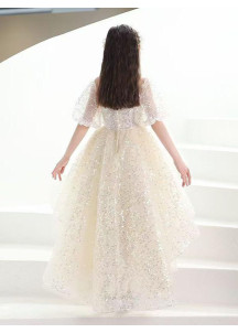 46,79 €Cette robe de cérémonie pour fillette est un rêve de princesse moderne. Confectionnée en tulle ivoire, elle est parsemée de sequins délicats qui scintillent à la lumière. La jupe ample et fluide, digne d'un conte de fées, apporte une touche de majesté à la silhouette. Le corsage ajusté, orné de broderies florales et de perles, est à la fois élégant et raffiné. Le col rond transparent et les manches courtes bouffantes, agrémentées de légers volants, ajoutent une touche de romantisme et de sophistication.