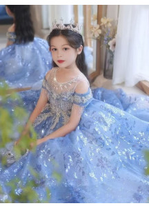 51,59 €Cette robe de fille de fleur évoque un conte de fées hivernal avec son bleu givré et ses détails scintillants. Le corsage ajusté, sans manches, est rehaussé d'un empiècement transparent brodé de motifs floraux argentés et orné de franges tombantes. Des perles et des sequins, délicatement cousus, ajoutent une touche de lumière féerique. La jupe ample, confectionnée en tulle léger, est parsemée de sequins et brodée de motifs floraux assortis au corsage, créant un effet visuel harmonieux et élégant.