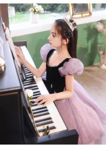 Cette charmante robe de fille de fleur allie à merveille l'élégance du velours noir à la légèreté du tulle scintillant. Le corsage noir, ajusté et rehaussé d'une discrète décoration de perles, contraste avec la jupe ample et vaporeuse en tulle rose poudré. Les petites manches bouffantes en tulle violet apportent une touche de couleur et de fantaisie supplémentaires.