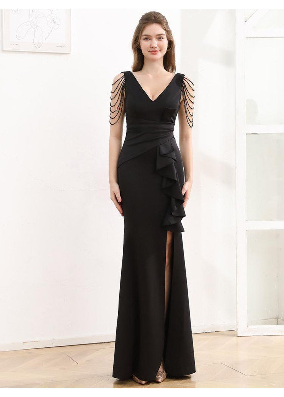 robe de soirée design moulant recouvert de sequins avec franges de perles
