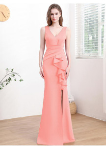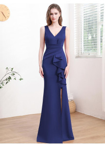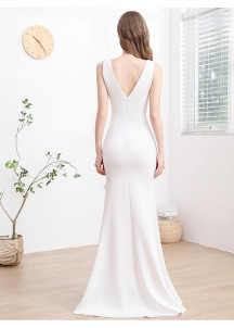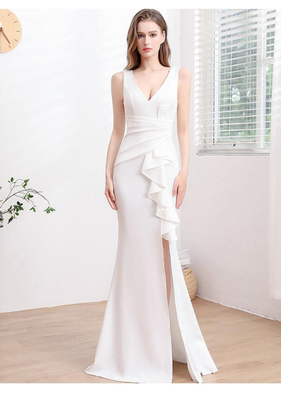 Cette robe de soirée blanche, élégante et sophistiquée, arbore une coupe sirène flatteuse qui épouse les courbes du corps. Le décolleté en V plongeant ajoute une touche de sensualité, tandis que les plis et le drapé sur la taille structurent la silhouette. La cascade de volants sur le côté apporte une note de romantisme et de mouvement. La fente haute sur la jambe allonge la jambe et ajoute une pointe de modernité. Un choix parfait pour une occasion spéciale, cette robe allie simplicité et raffinement. Le design est réussi, la combinaison de textures et de coupes est harmonieuse et crée un effet visuel très chic.