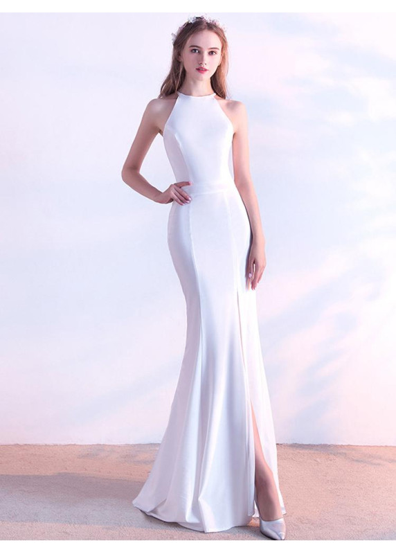Cette robe de soirée blanche est d'une élégance intemporelle et raffinée. Sa coupe sirène, ajustée à la taille puis évasée, met subtilement en valeur la silhouette. Le haut, avec son décolleté rond et son dos nu, est à la fois chic et moderne. La jupe longue, légèrement fendue sur le côté, apporte une touche de sensualité sans être vulgaire. Le tissu, d'apparence soyeuse et fluide, contribue à la fluidité de la robe. Le design est simple mais efficace : la pureté des lignes et la coupe impeccable créent un look sophistiqué et élégant. La couleur blanche, symbole de pureté et d'élégance, est un choix parfait pour une occasion spéciale. L'absence de fioritures permet à la beauté du tissu et de la coupe de s'exprimer pleinement.