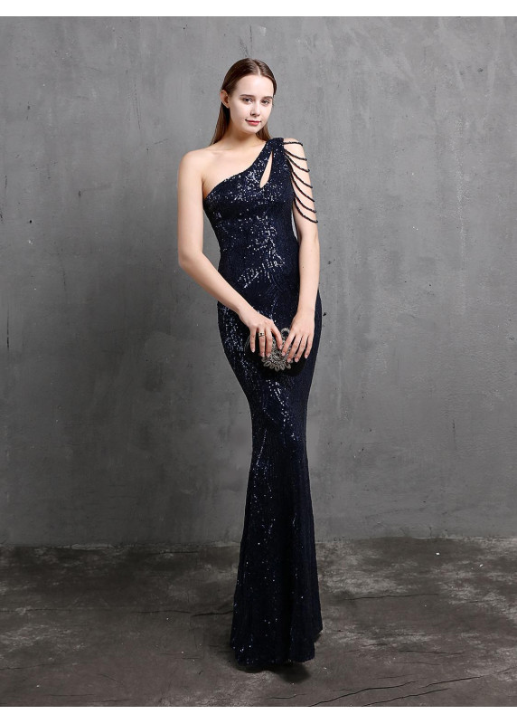 robe de cérémonie à paillettes dorées avec col asymétrique à franges de perles