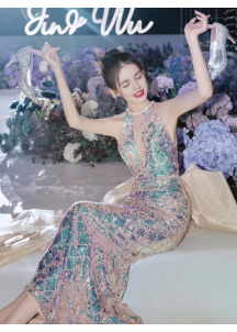 Cette robe de soirée est confectionnée en sequins rose pâle et argentés, et présente une silhouette sirène avec un décolleté plongeant et un dos nu. Elle est à la fois élégante et sexy, et ne manquera pas de faire tourner les têtes.